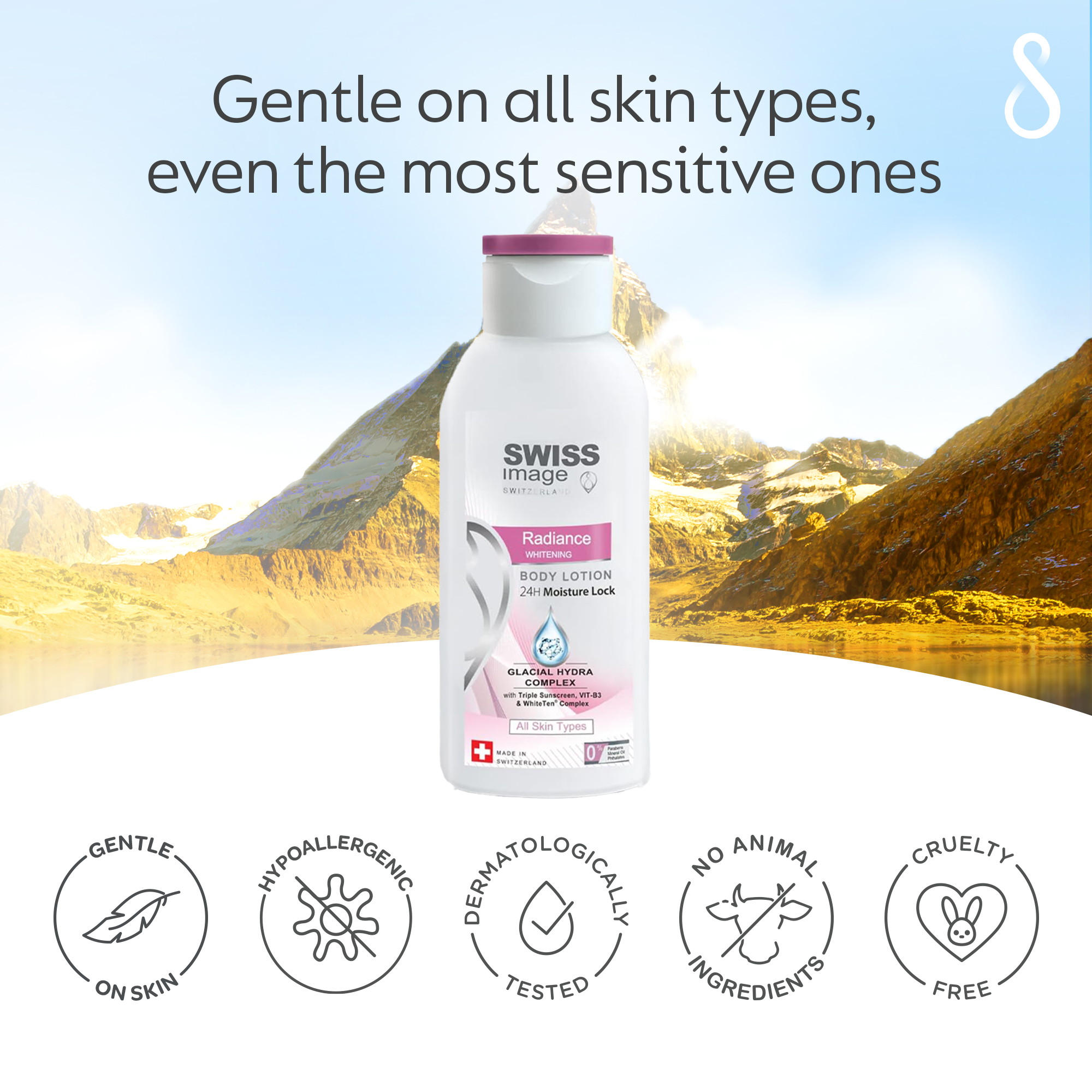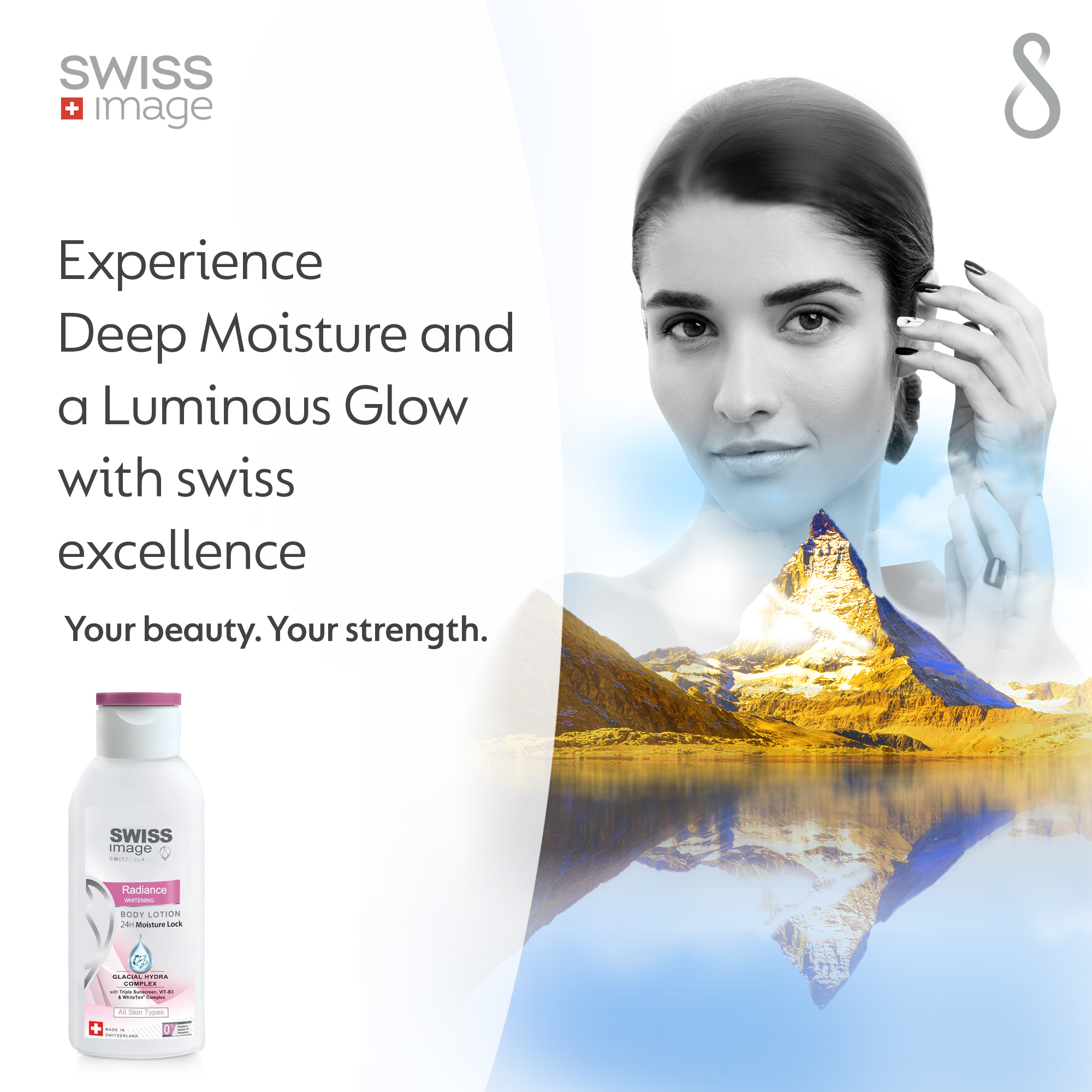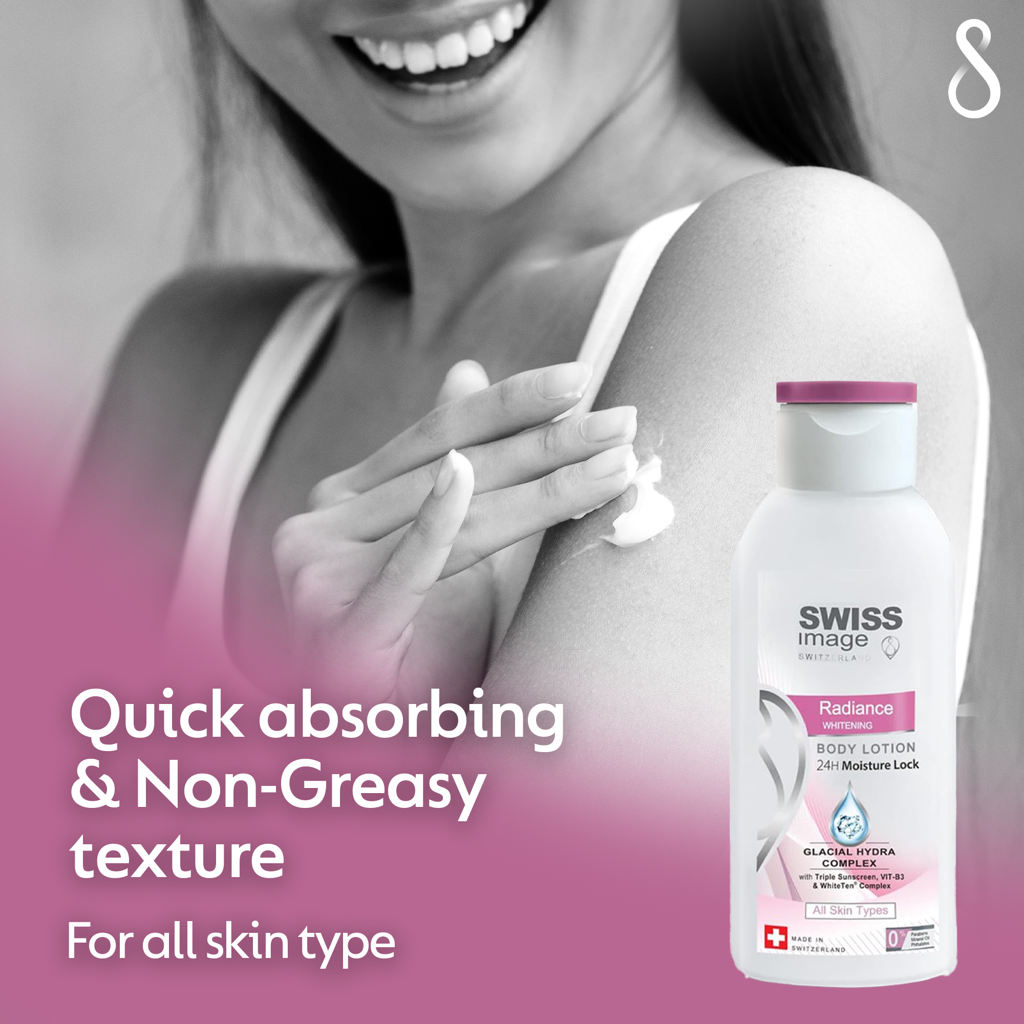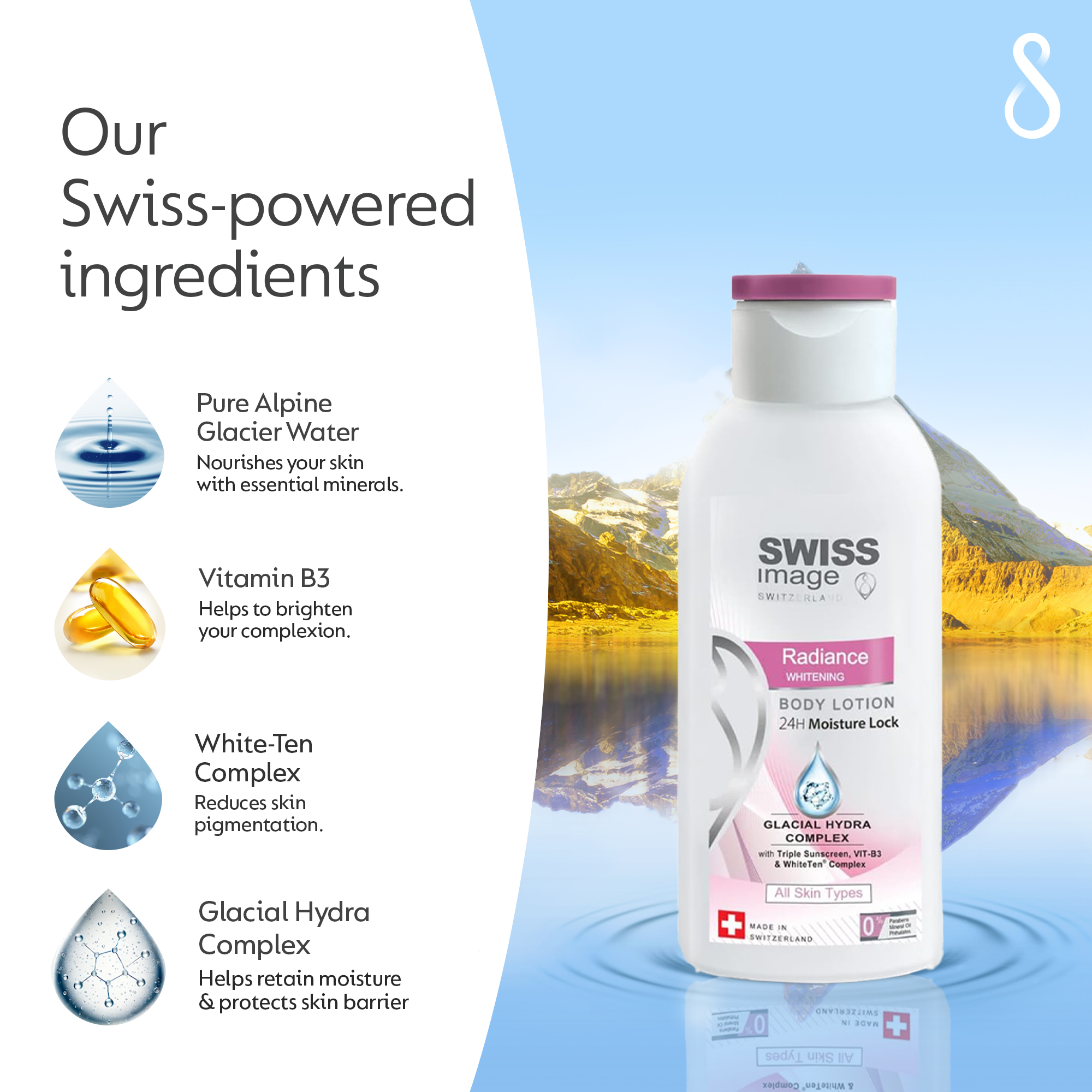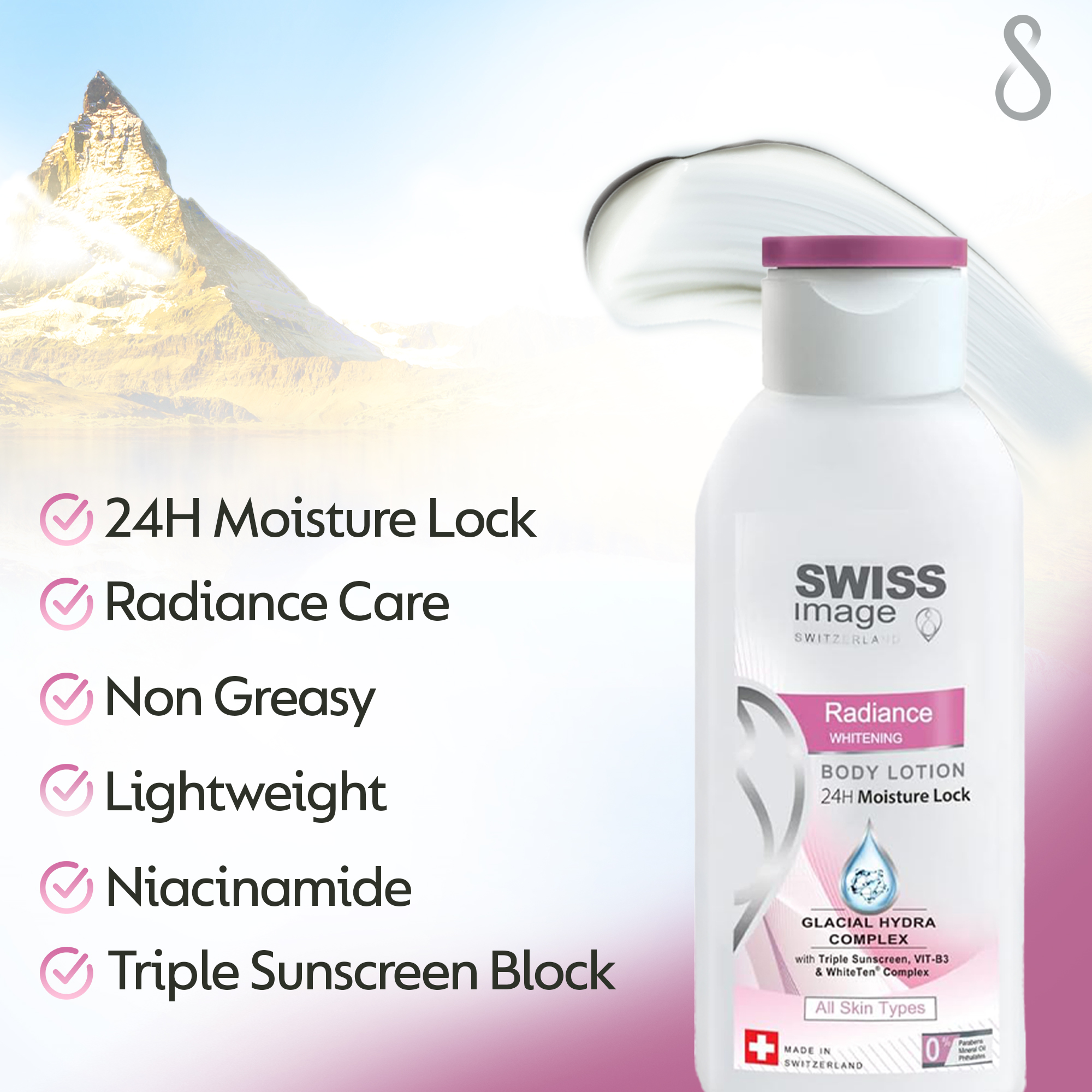 Лосьон для тела Swiss Image Radiant для всех типов кожи, 250 мл С тройными солнцезащитными фильтрами и ниацинамидом | Легкий и нежирный для глубокого увлажнения и сияния кожи