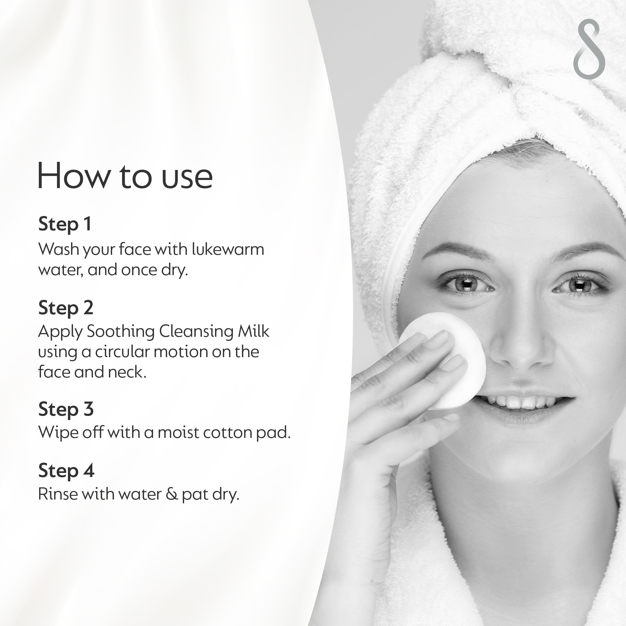 Шаг 1 Вымойте лицо теплой водой и высушите. Шаг 2 Успокаивающее очищающее молочко Aplly нанесите круговыми движениями на лицо и шею. Шаг 3 Протрите влажным ватным диском Шаг 4 Промойте водой и высушите