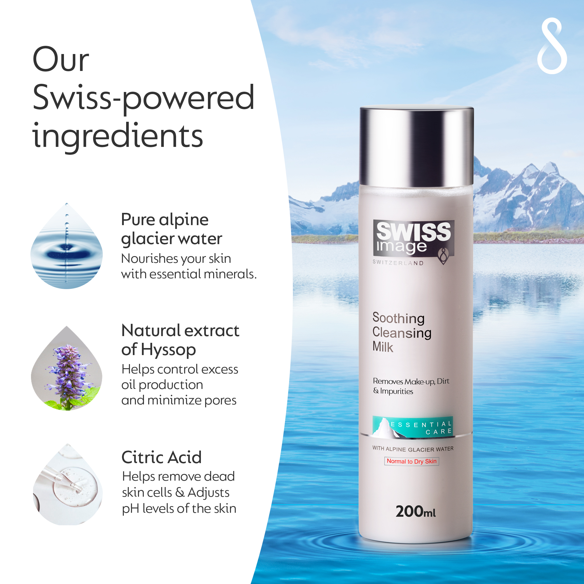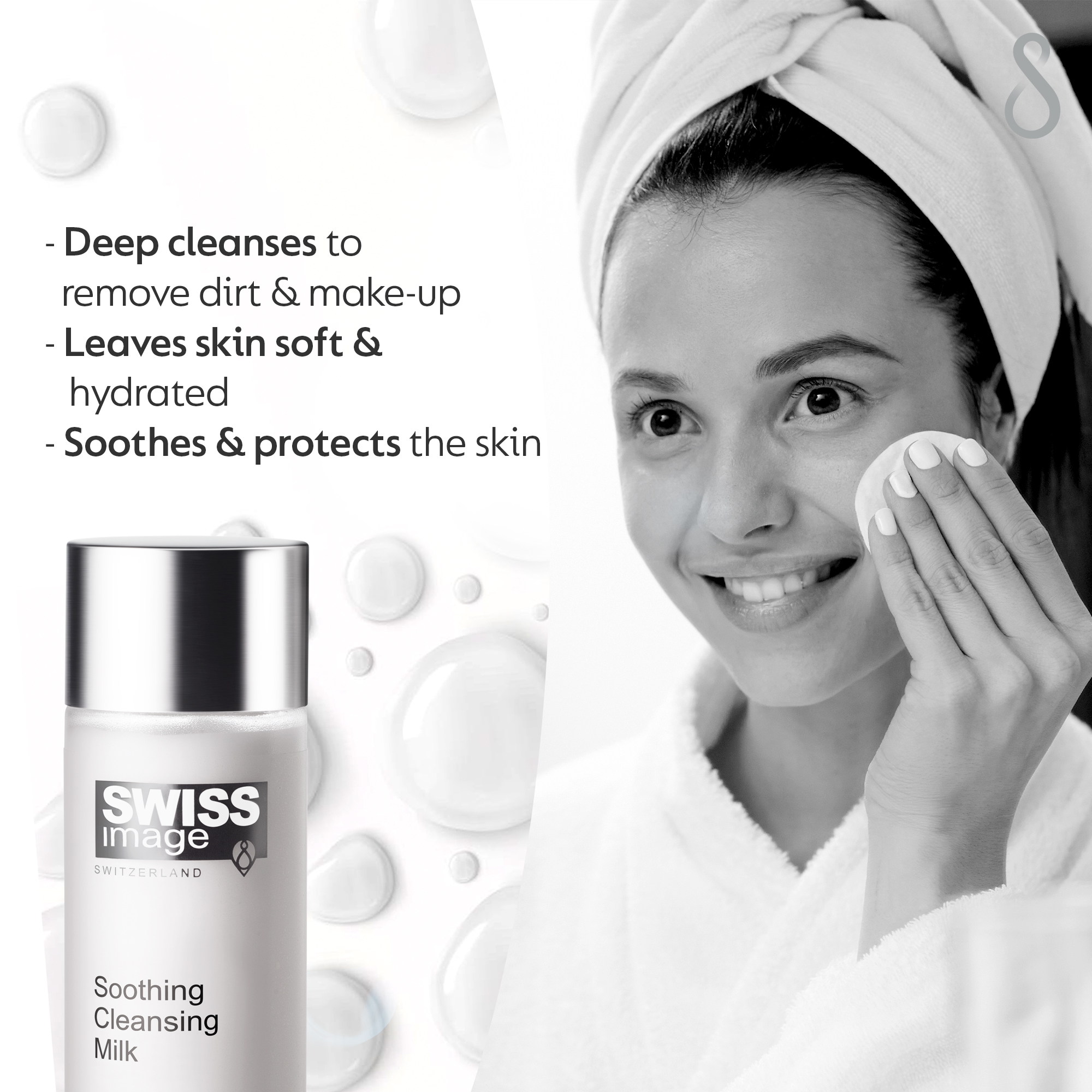 Swiss Image Успокаивающее очищающее молочко 200 мл | Нежирное нежное очищающее средство для лица и средство для снятия макияжа | Увлажняет, успокаивает, осветляет и удаляет загрязнения | Для нормальной и сухой кожи | Сделано в Швейцарии | Мужчины и женщины