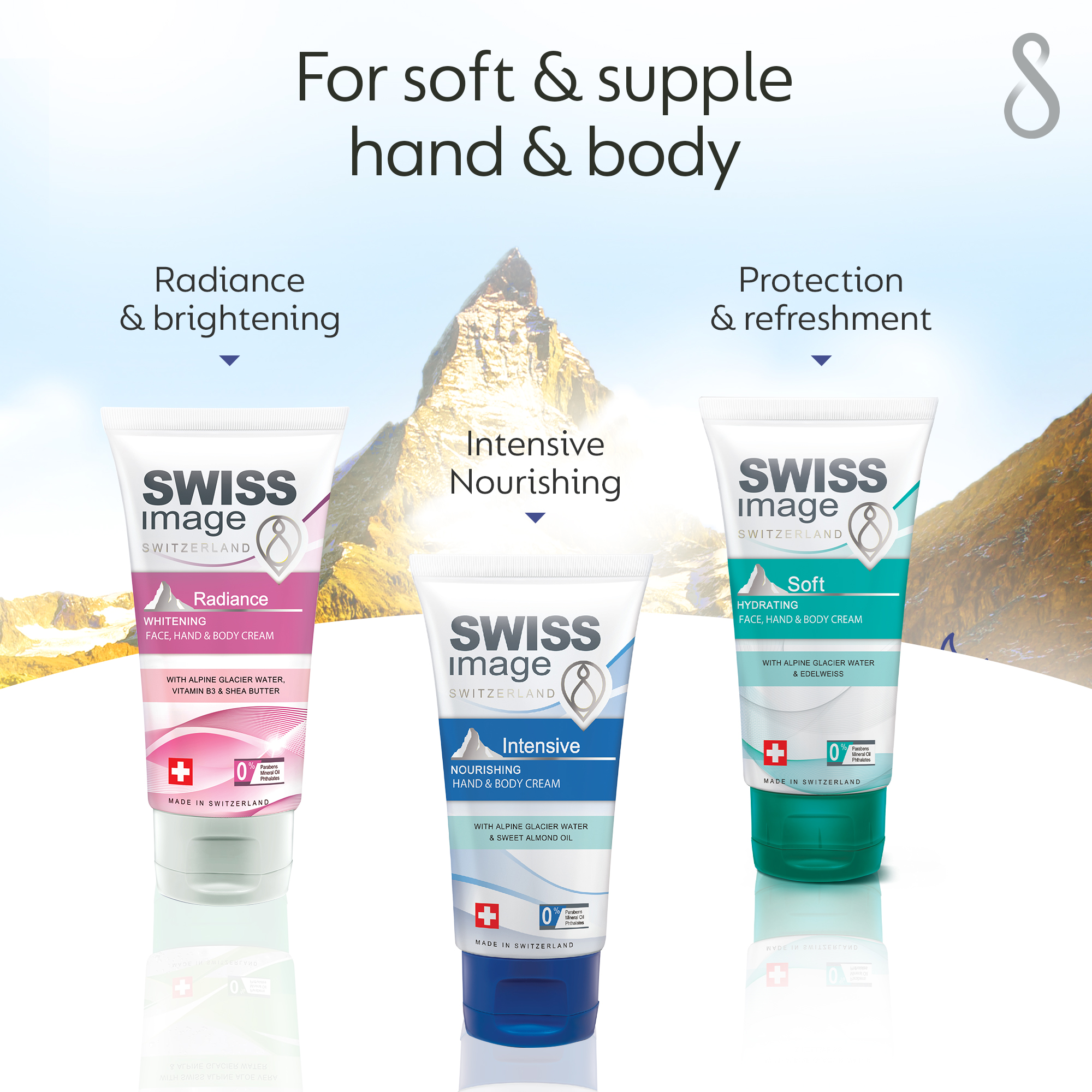 Успокаивает кожу, делая ее упругой и свежей Укрепляет естественный барьер кожи и увлажняет руки и тело. Питает и увлажняет кожу, легко впитывается кожей. СОДЕРЖИТ УНИКАЛЬНЫЕ ИНГРЕДИЕНТЫ Уникальные ингредиенты продуктов Swiss Image добываются из альпийских ледников. Комбинация этих ингредиентов идеальна для регенерации и восстановления кожи, восстановления ее уровня влажности и свежести. ЧИСТЫЙ И НАТУРАЛЬНЫЙ УХОД ЗА КОЖЕЙ Все наши продукты не содержат парабенов, минеральных масел и фталатов.